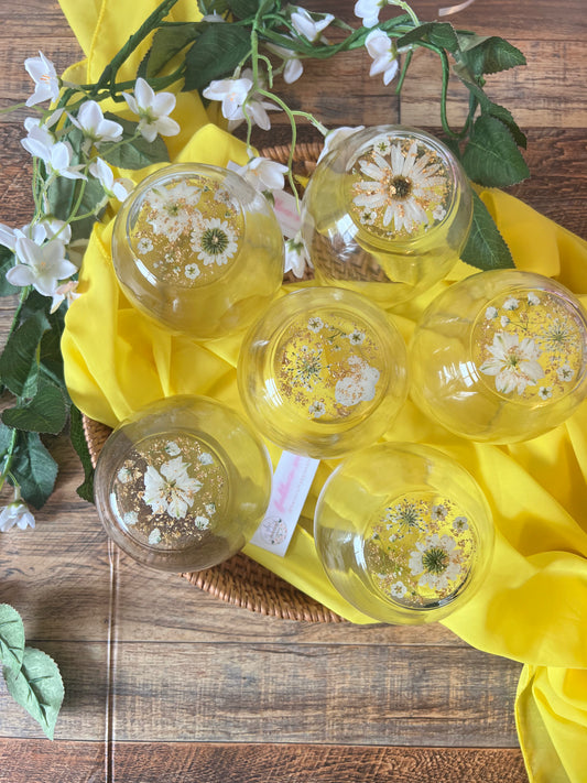 Personalized Steamless Wine Glass with real -WHITE FLOWERS-Custom name Gift Ready