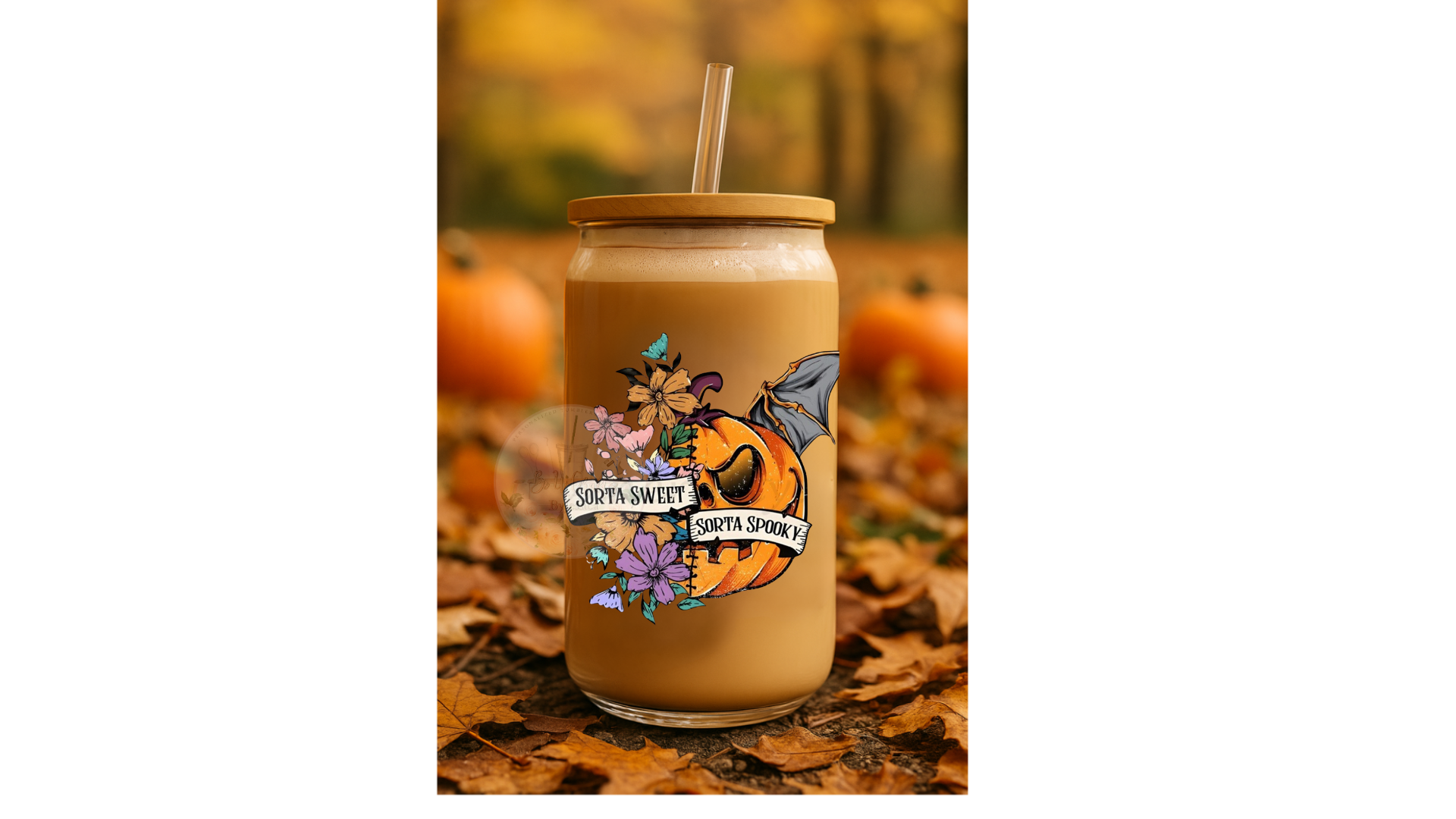 Each glass comes with a bamboo lid, reusable straw, and care instructions — making it stylish, practical, and eco-friendly. The unique split design features fall florals on one side and a spooky jack-o-lantern with bat wings on the other, perfect for those who are “a little sweet, a little spooky.”