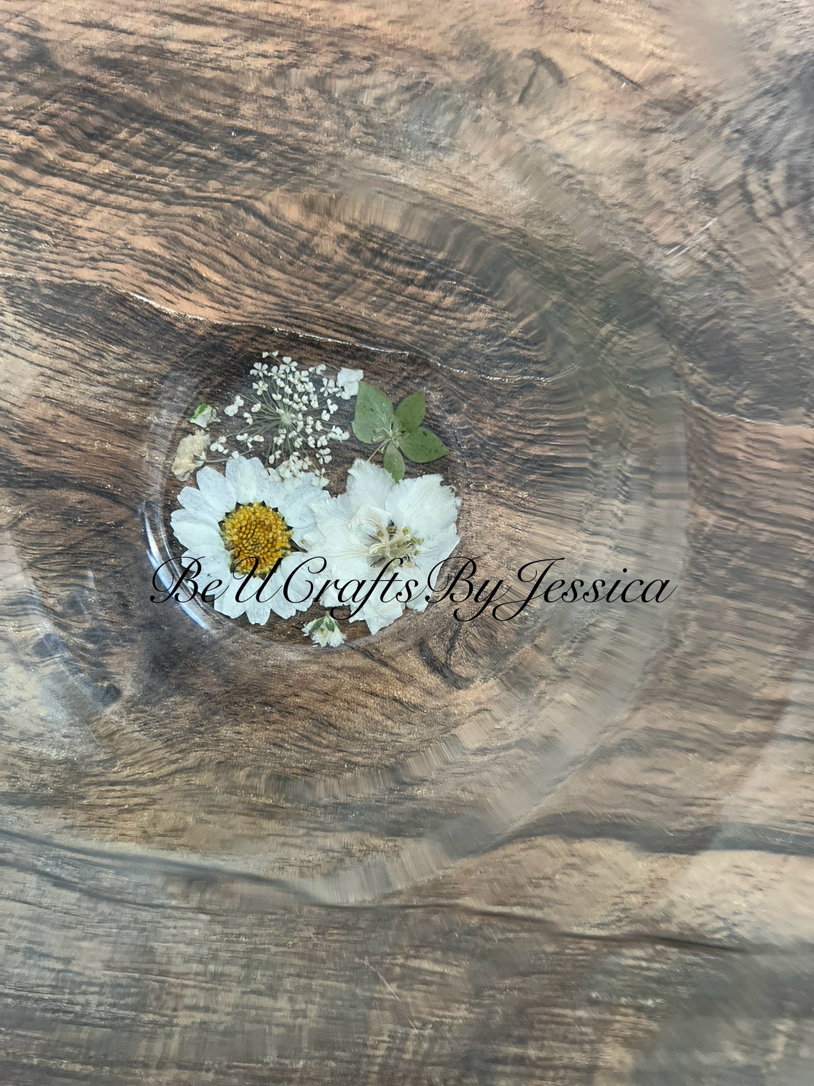 This custom, handmade wine glass can be personalized with your choice of dried pressed flower colors and finished with gold, silver, or copper leaf flakes at the outer bottom of the glass, coated in resin. For specific flower arrangements, please send me a message. If no preferences are provided, I will choose different types of flowers based on the color you selected at checkout.